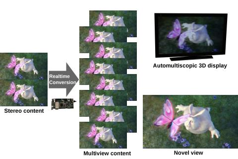 This paper presents a new method for converting stereoscopic content to a multiview version that is suitable for presenting on automultiscopic displays. It also demonstrates hardware implementation capable of performing the conversion on-the-fly. User experiments show that the approach outperforms current real-time solutions.