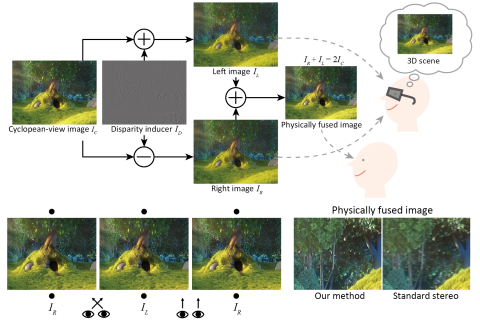 This method generates perfectly ghost-free stereo image pairs for viewers without stereo glasses. The idea is to produce binocular disparity by adding a phase-shifting pattern, and its negative, to an image. Physical fusion of the pair cancels out the disparity components, leaving only the original 2D image visible.