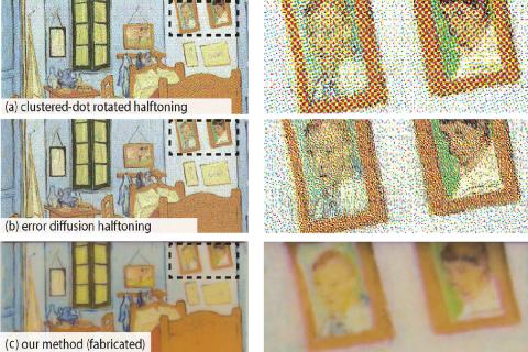 Introducing a novel color-reproduction method for 3D printing. In contrast to current halftoning techniques that use surface-color mixing, this technique mixes colors inside the printed volume, which mitigates the variety of artifacts associated with color halftoning.