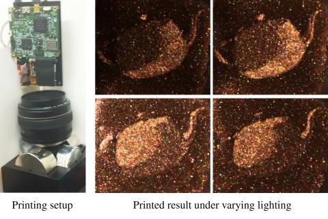 A printer that embeds magnetic flakes in a photo-cured resin, allowing orientation distribution of the flakes to be controlled with a magnetic field at fabrication time. The paper demonstrates optical effects including bump maps: flat surfaces with spatially varying specular lobe direction.