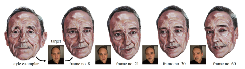 This approach to automatically transfer artistic style from an existing exemplar image to a video sequence containing a human face preserves both the subject's identity and the visual richness of the style exemplar, and it introduces a controllable amount of temporal dynamics that approximates the appearance of real hand-painted animations.