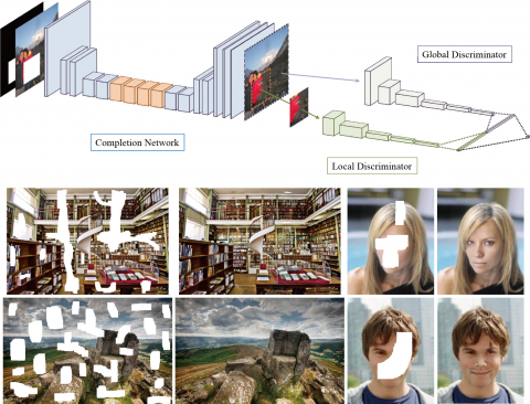 This novel architecture for image completion based on convolutional networks uses two auxiliary networks to learn both locally and globally consistent completion, including novel-object generation, which achieves natural completion for challenging scenes such as indoor rooms and human faces.