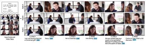 In this system for editing video of dialogue-driven scenes, the input is a script and multiple video takes, capturing different camera framings or performances of the scene. The system automatically selects a clip from one of the takes for each line of dialogue, based on film-editing idioms.